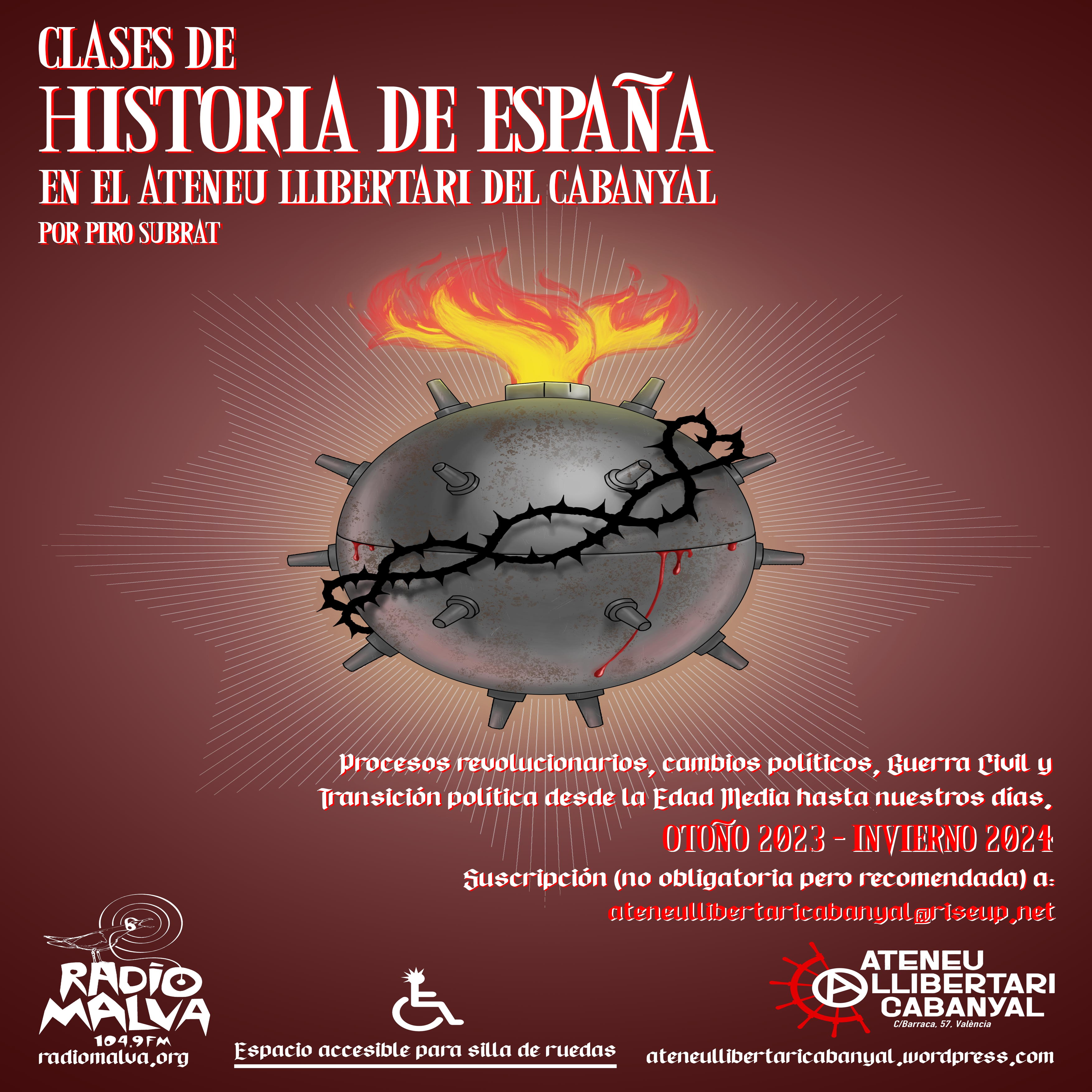 Por ello este otoño-invierno contaremos en el Ateneu Llibertari del Cabanyal con un curso de formación en lo llamado “Historia de España” que abarcará desde la Edad Media hasta los inicios del siglo presente, con especial incidencia en la construcción de la identidad nacional y en los acontecimientos revolucionarios del siglo XX –la “Guerra Civil” y la “Transición”-.